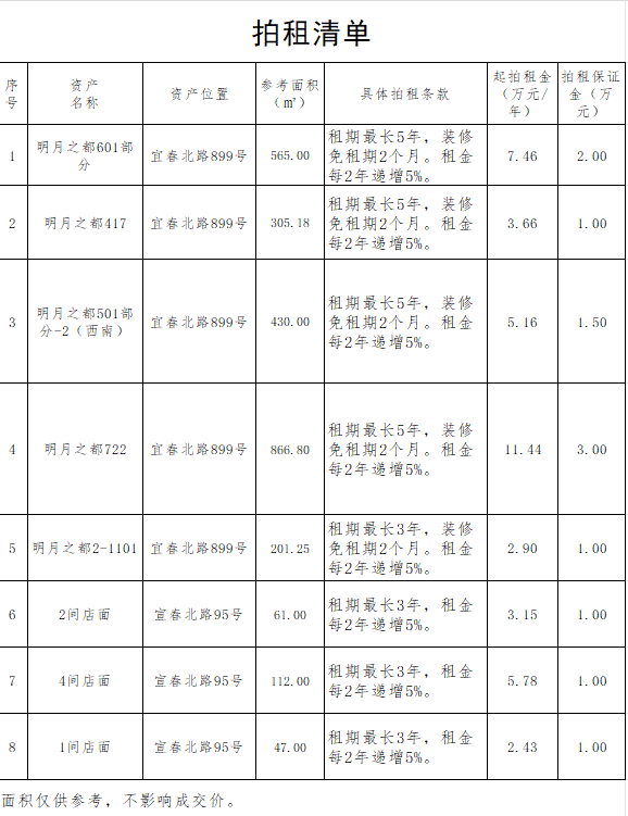 一、拍租標的:宜春北路899號明月之都部分房產、宜春北路95號一樓店面,詳情見本公司拍租清單。