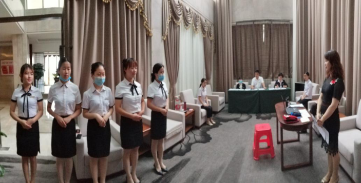 為有效應(yīng)對(duì)新冠肺炎防控工作,科學(xué)謀劃復(fù)工復(fù)產(chǎn),抓好新形式下常態(tài)化管理,提高員工服務(wù)技能,東湖酒店于2020年5月21日開展了首屆技能比武大賽??头繕菍?、前廳所有人員均參加了此項(xiàng)活動(dòng)。比賽包括儀容儀表、現(xiàn)場(chǎng)模擬、知識(shí)搶答、防控要領(lǐng)、技能比武等項(xiàng)目。形式活潑、內(nèi)容豐富,知識(shí)性、趣味性和實(shí)操性強(qiáng)。