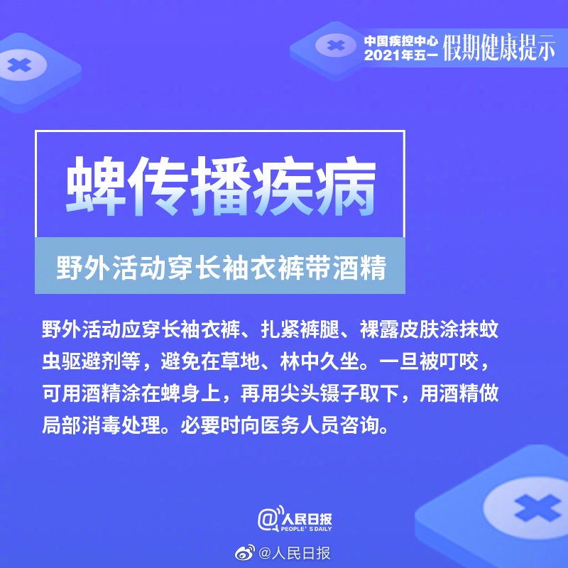“五一”假期臨近,中國疾病預(yù)防控制中心通過官方微信公眾號發(fā)布健康提示,建議重點做好新冠肺炎、諾如病毒腸炎、手足口病、蜱傳播疾病、動物傳播疾病和食物中毒的預(yù)防與防范。