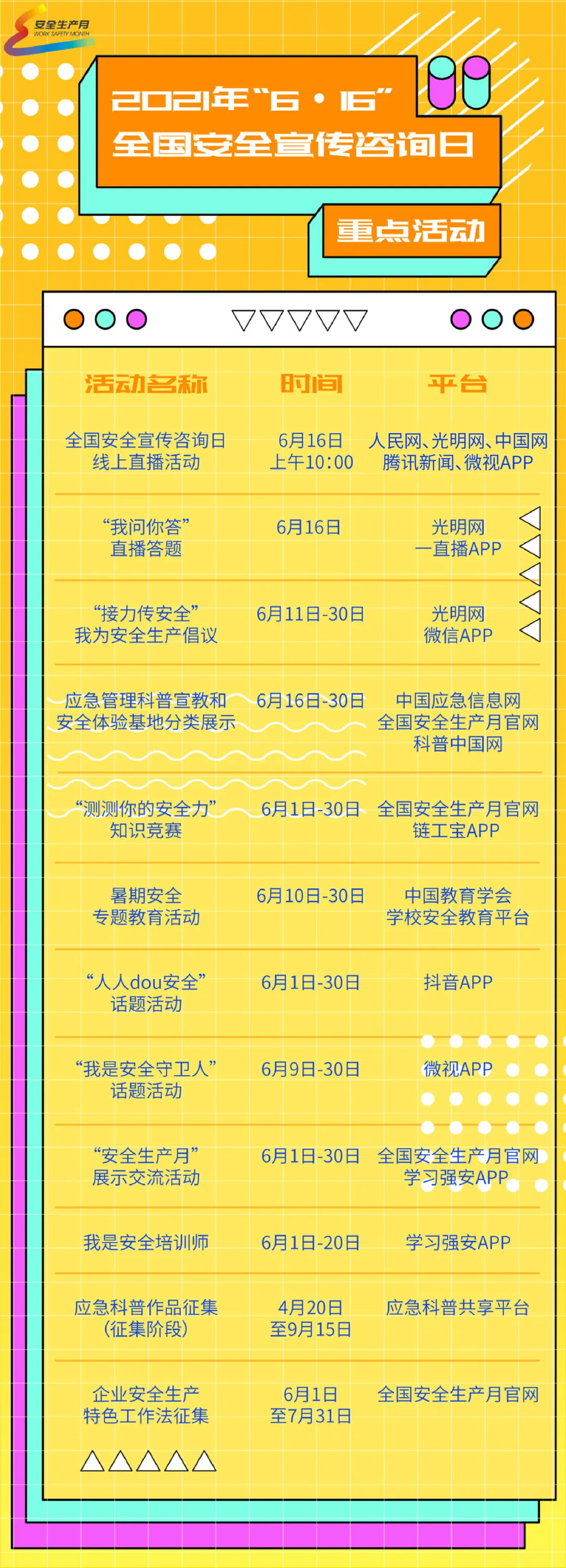 6月16日是全國安全宣傳咨詢?nèi)眨凑諊鴦?wù)院安委會(huì)辦公室、應(yīng)急管理部統(tǒng)一要求,在應(yīng)急管理部新聞宣傳司指導(dǎo)下,在人民網(wǎng)、光明網(wǎng)、中國網(wǎng)、中國應(yīng)急信息網(wǎng)、全國安全生產(chǎn)月官網(wǎng)、科普中國網(wǎng)、應(yīng)急科普共享平臺(tái)、微博、微信、微視、抖音等新媒體平臺(tái),開展全國安全宣傳咨詢?nèi)站€上直播、“我問你答”直播答題、“接力傳安全”我為安全生產(chǎn)倡議、應(yīng)急管理科普宣教和安全體驗(yàn)基地分類展示、“測(cè)測(cè)你的安全力”知識(shí)競賽、“安全生產(chǎn)月”展示交流等系列活動(dòng),學(xué)習(xí)安全知識(shí)的同時(shí),還可獲得各種獎(jiǎng)品,福利多多、好處多多,詳情請(qǐng)關(guān)注全國安全生產(chǎn)月官網(wǎng)。具體活動(dòng)預(yù)告如下: