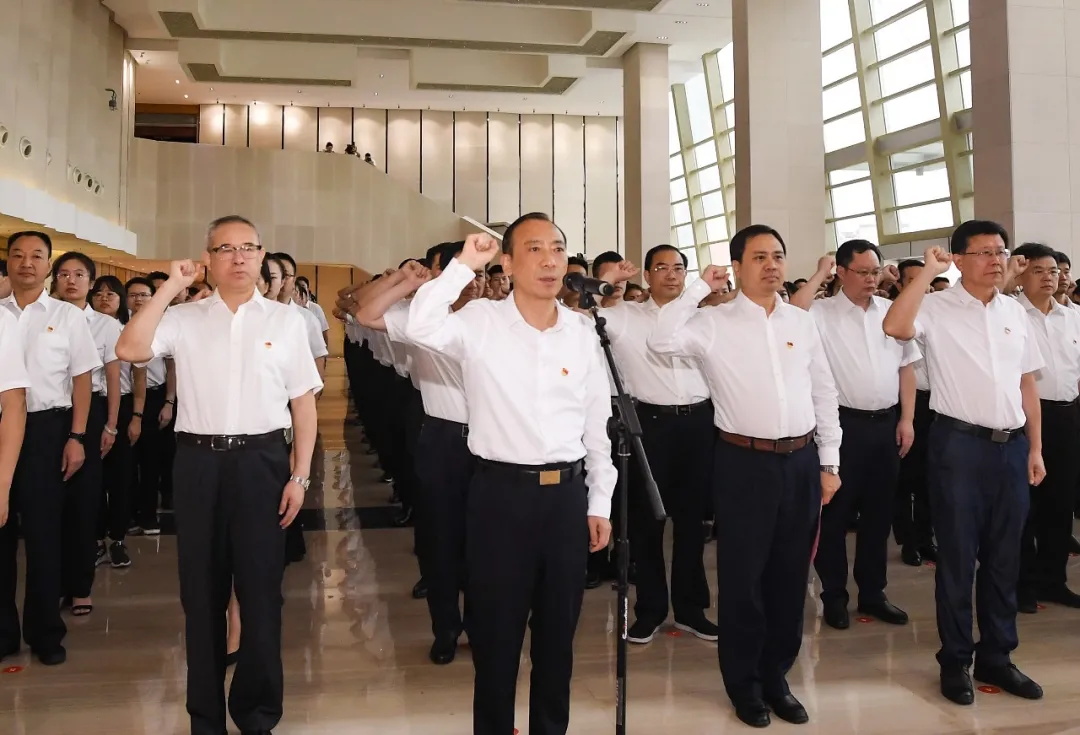 市委書記于秀明領(lǐng)誓并講話。市委副書記、市長嚴(yán)允主持。張鑒武、陳榮等市四套班子黨員領(lǐng)導(dǎo)出席活動。