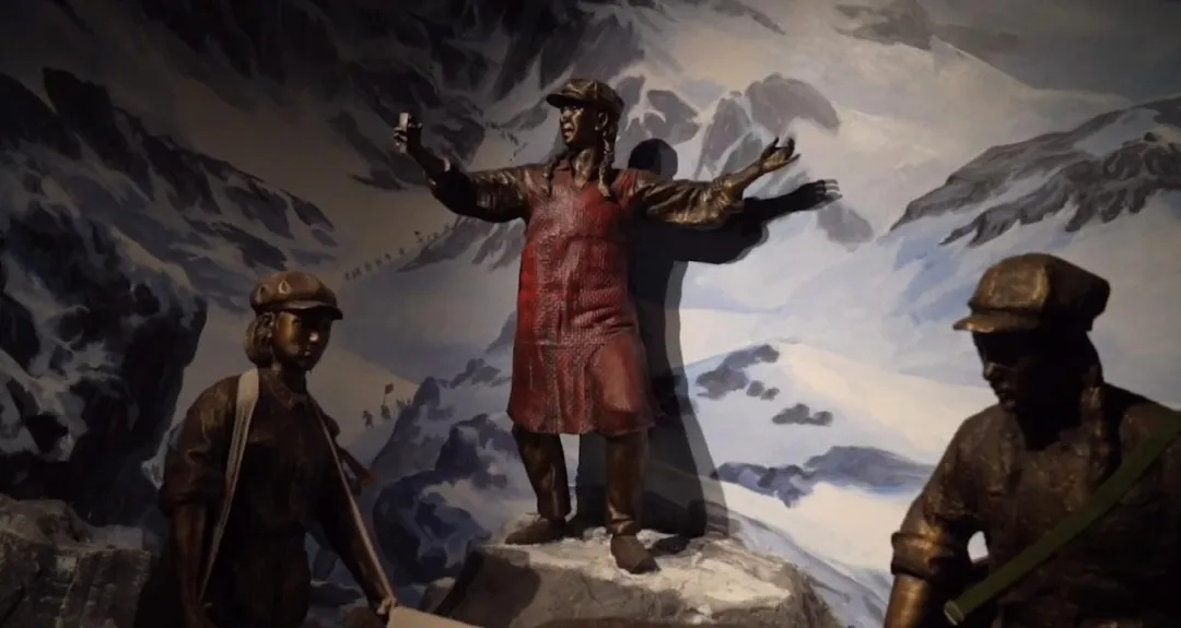 在紀(jì)念館里,有一座穿紅色毛衣女紅軍的雕塑,這位女紅軍是隊(duì)伍里的一名衛(wèi)生員。在翻雪山時(shí),這位小戰(zhàn)士身體單薄,同行的女戰(zhàn)士將身上唯一一件紅毛衣穿到她的身上。小姑娘開心地跑前跑后,打著快板把行進(jìn)中的故事編成歌謠唱給大家聽,在漫天風(fēng)雪里給戰(zhàn)士們送去歡笑和希望。她的紅色身影活躍在寒冷的風(fēng)雪中,像一團(tuán)熾熱的火,戰(zhàn)士們親切地喊她“小太陽”。