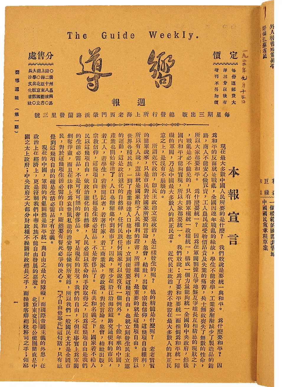 1922年9月13日,中國(guó)共產(chǎn)黨機(jī)關(guān)刊物《向?qū)А分軋?bào)在上海創(chuàng)刊。圖為該刊創(chuàng)刊號(hào)。
