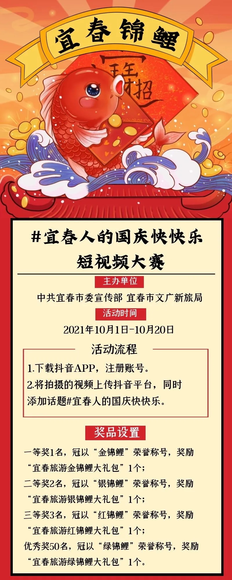 點(diǎn)擊文章底部“寫留言”,說說你的國慶出游計(jì)劃,如“我們一家國慶準(zhǔn)備去靖安中源鄉(xiāng)避暑”,并分享你的推薦理由,同時(shí)將文章鏈接分享到朋友圈。我們將陸續(xù)從中選取99條精彩留言進(jìn)入精選,截至10月5日21:00,獲贊最高的留言將被授予“宜春旅游金錦鯉”榮譽(yù)稱號,并獎勵(lì)金錦鯉大禮包一份。