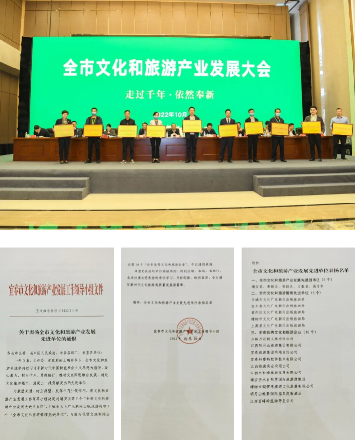 10月29日至30日,全市文化和旅游產(chǎn)業(yè)發(fā)展大會(huì)在奉新縣舉行。市委書(shū)記于秀明出席會(huì)議并為2023年全市文化和旅游產(chǎn)業(yè)發(fā)展大會(huì)承辦地豐城市授旗。市委副書(shū)記、市長(zhǎng)嚴(yán)允出席會(huì)議并講話。市政協(xié)主席袁川出席。省文化和旅游廳副廳長(zhǎng)陳曉平到會(huì)指導(dǎo)。大會(huì)由市委常委、市委宣傳部部長(zhǎng)方艷茹主持。市人大常委會(huì)副主任熊勤香,副市長(zhǎng)江東燦,市政協(xié)副主席彭金平,市人民檢察院檢察長(zhǎng)張樂(lè),市人大常委會(huì)副主任提名人選、市委秘書(shū)長(zhǎng)吳依群,市政府秘書(shū)長(zhǎng)徐勇軍出席會(huì)議。來(lái)自市內(nèi)外的文旅企業(yè)、A級(jí)景區(qū)、鄉(xiāng)村旅游點(diǎn)和星級(jí)飯店代表參加會(huì)議。會(huì)上,市政府副市長(zhǎng)江東燦宣讀《關(guān)于表?yè)P(yáng)全市文化和旅游產(chǎn)業(yè)發(fā)展先進(jìn)單位的通報(bào)》,并為受表?yè)P(yáng)的先進(jìn)單位頒獎(jiǎng)。宜春旅游集團(tuán)榮獲“全市優(yōu)秀文化和旅游企業(yè)”殊榮!